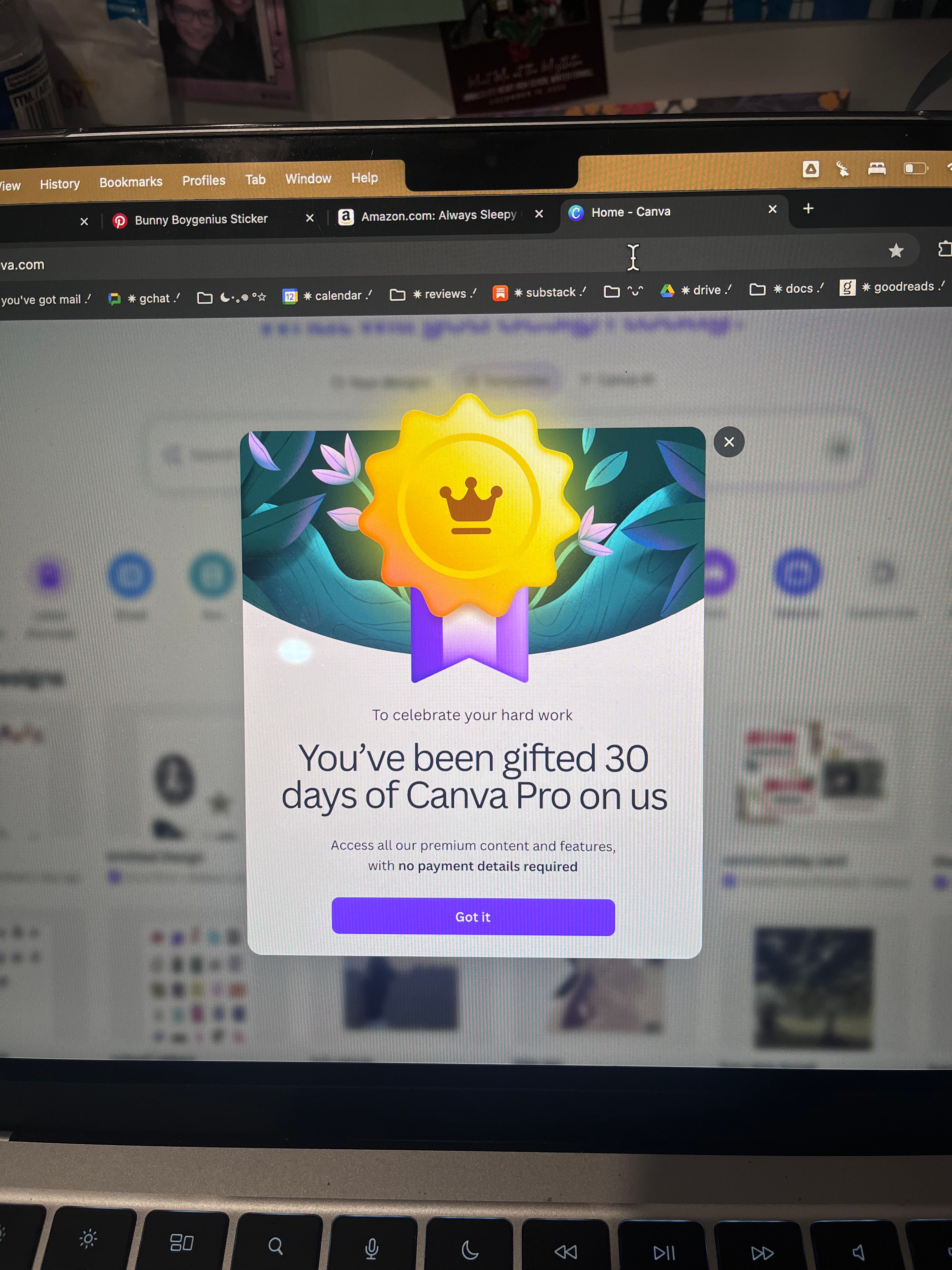 for some reason canva decided to give me 30 days of canva pro for free? which i should be taking advantage of right now… i think my art block has to disappear.